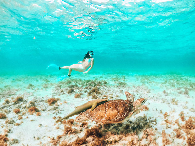 But the HIGHLIGHT of Spotts Beach in Grand Cayman for us was the snorkeling, because both days that we visited this beach, we were able to spot several sea turtles, probably about 6 total! We also saw sting rays, fish, and some coral & rock formations, but the sea turtles took the cake! You’ll have a good chance of seeing them in the late afternoon/early evening when they come in to feed on the sea-grass.
